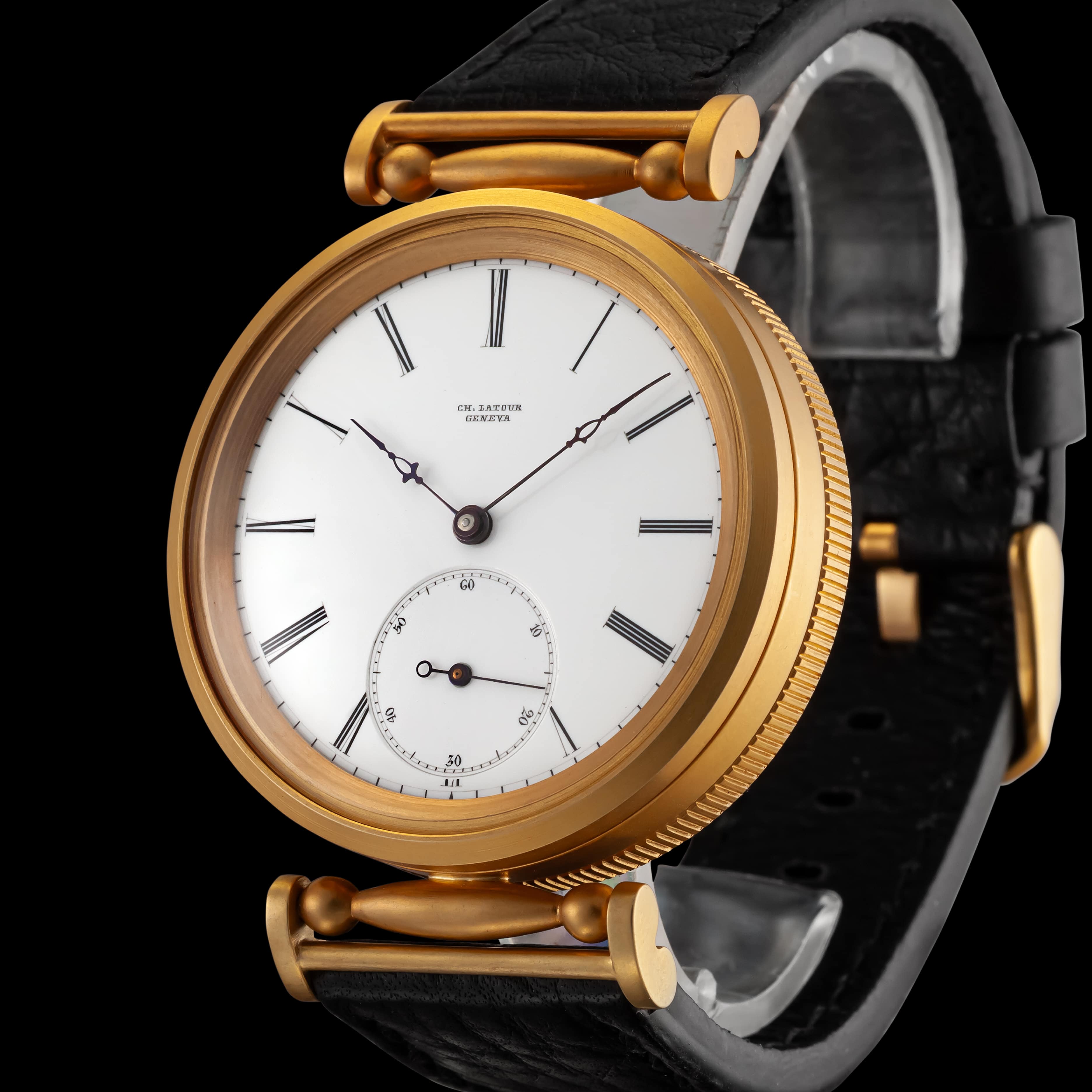 Experience timeless craftsmanship with this Charles Latour key-wind wristwatch, featuring a restored antique pocket watch movement in a new handcrafted case. The original enamel dial is beautifully preserved, and the watch comes fully serviced with its winding key included — a rare collector’s piece that unites vintage heritage with modern wearability.